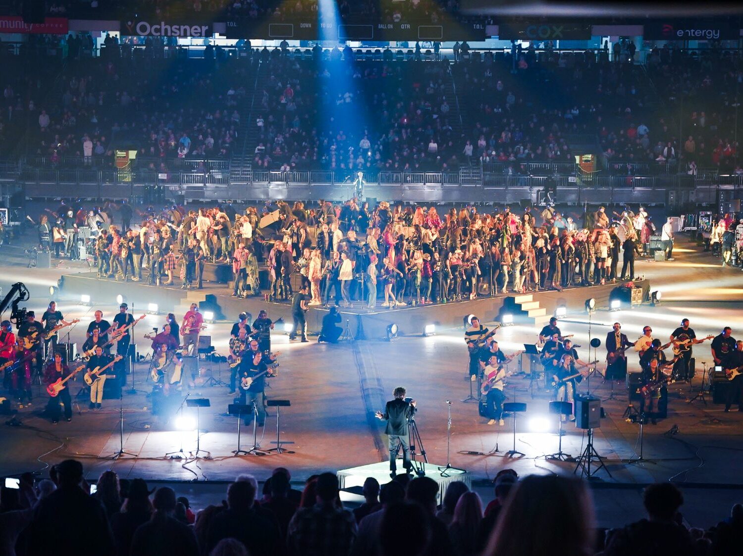 L’evento ha seguito la struttura tipica di Rockin’1000: una grande orchestra rock composta da chitarristi, bassisti, batteristi, cantanti e fiati che suonano all’unisono, puntando più sull’impatto collettivo che sull’esibizione individuale. È una formula che non cerca di sorprendere per originalità, ma per scala, e che proprio per questo funziona in spazi pensati per lo sport e per i grandi eventi, come il Superdome.